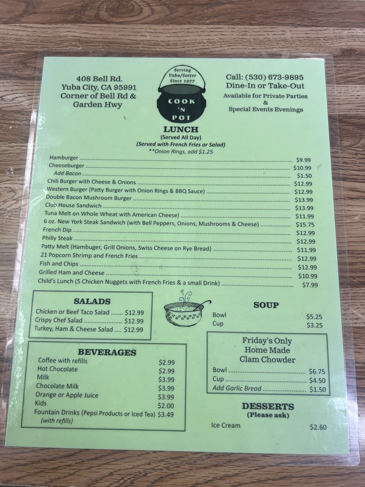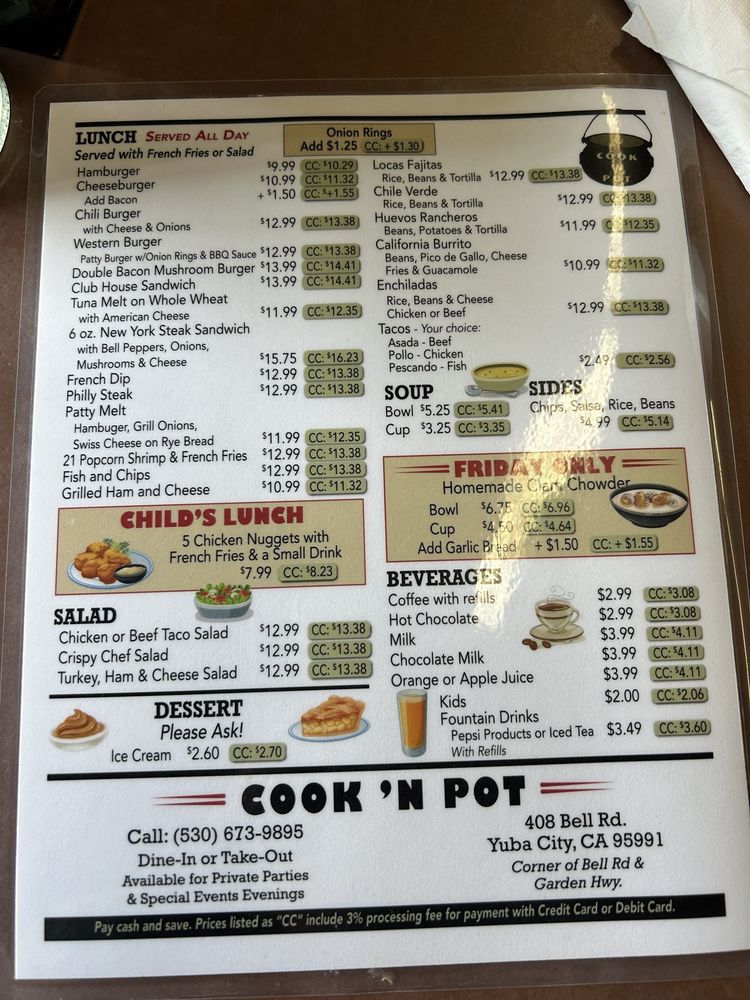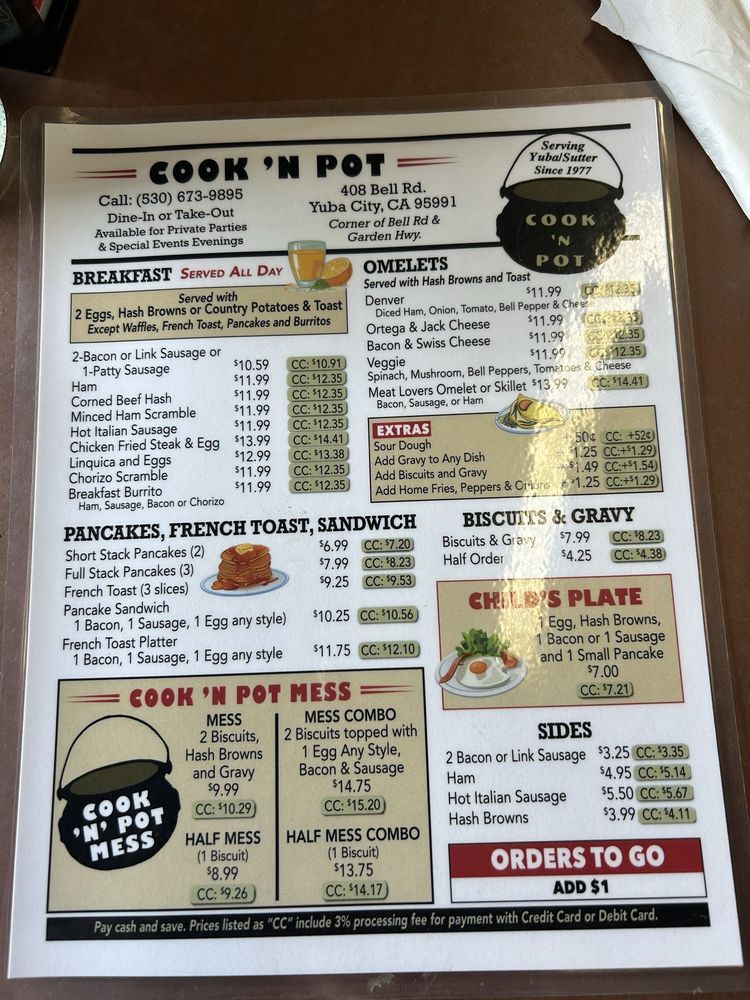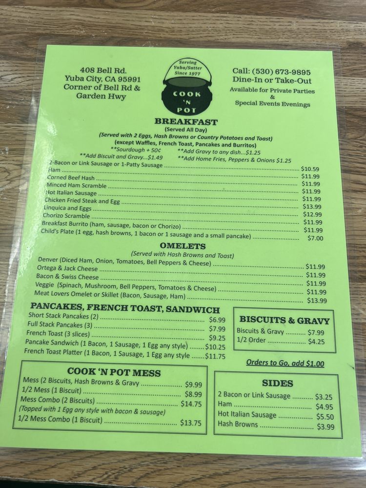 Introducing the culinary gem that is Cook N’ Pot, located in the heart of Yuba City, CA. This American eatery captures the essence of home-cooked comfort with its casual ambiance and friendly service. Renowned for its signature dish, "The Mess," diners rave about its generous portions, perfect for sharing. Those who enjoy breakfast will be delighted by the fluffy biscuits, crispy bacon, and satisfying hash browns, all complemented by strong, flavorful coffee.